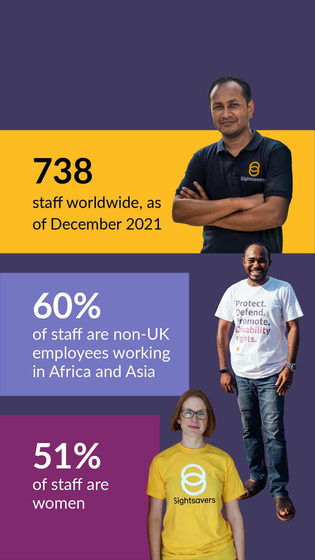 Sightsavers’ staff continued to excel in 2021, and many were rewarded for their efforts. Anande Swai, Dr Sencodri Njau and Dr Upendo Mwakabalile received Vision Excellence Awards from the International Agency for the Prevention of Blindness. Gertrude Oforiwa Fefoame received the inaugural World Blind Union Women’s Empowerment Award, while researcher Kareen Atekem was a finalist in the NTD Innovation Prize competition. We ended the year on a high by winning a prestigious Zero Project award for our accessibility audit pack.